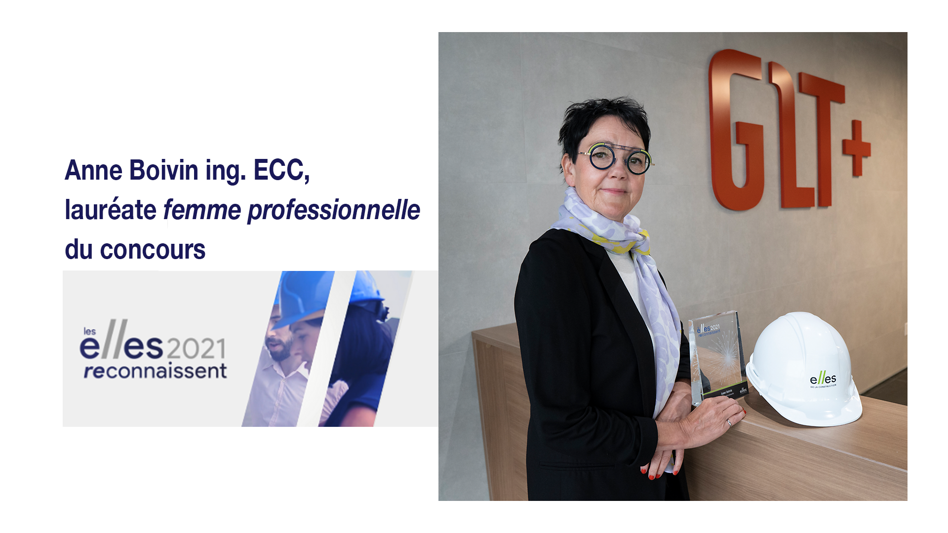 Toute l’équipe de GLT+ tient à féliciter Anne Boivin ing., ECC VP Stratégies de projets, Gestion de projets, Estimation et BIM, qui a été choisie Lauréate de la catégorie Femme professionnelle du concours Les Elles reconnaissent 2021.