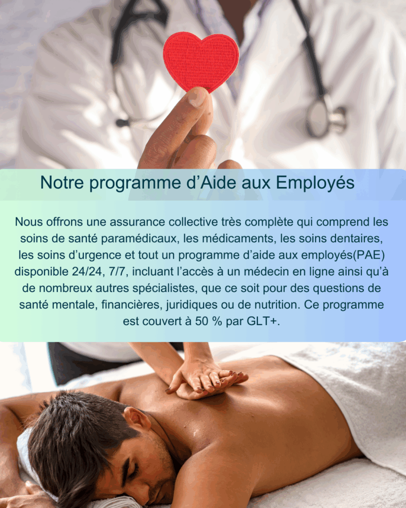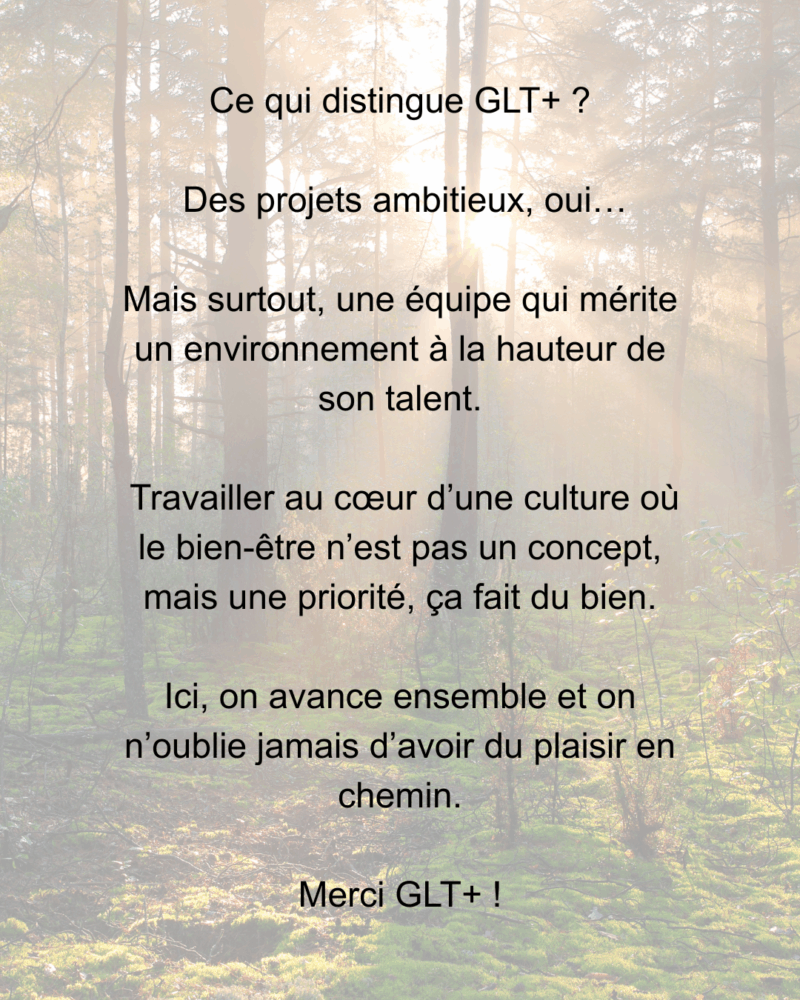 Le mieux-être au travail fait partie de notre culture : en soutenant nos équipes, en valorisant leurs talents et en créant un environnement humain et inspirant, nous bâtissons un milieu où chacun peut s’épanouir pleinement. C’est ce qui fait de GLT+ un employeur dont on est fier de faire partie.